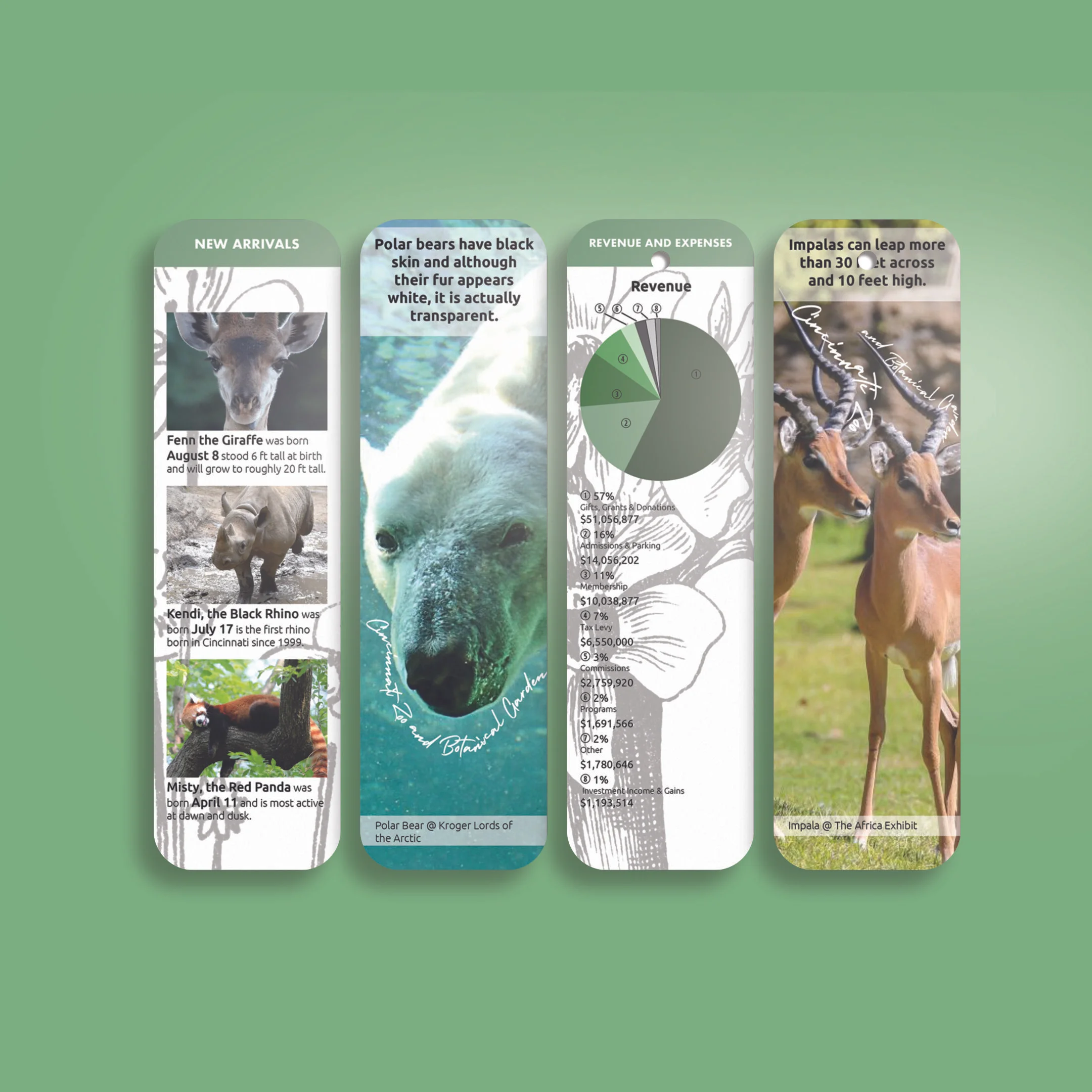 Annual reports create a fair amount of paper waste each year. The problem I wanted to solve was how to reduce the amount of paper used to create these reports while also making them more accessible to the public. My solution was to create bookmarks, condensing the information and providing aesthetically pleasing images for people to use and share.