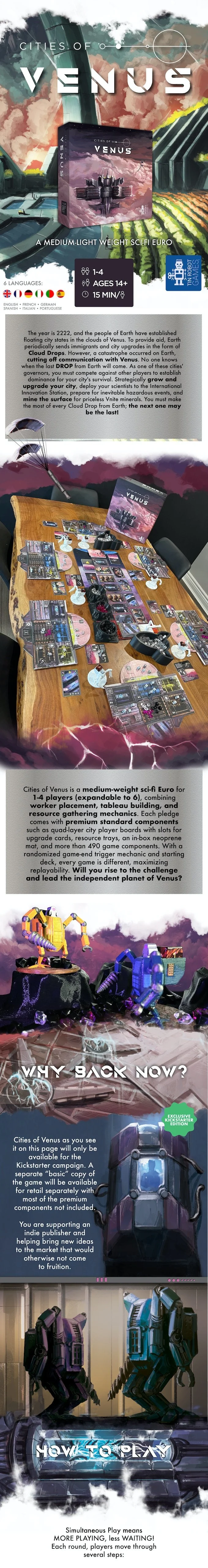 I had the absolute pleasure of working with Tin Robot Games on their Kickstarter page for their newest game, Cities of Venus. Cities of Venus is a worker placement medium-light euro game about setting up colonies in the clouds of venus. While working on this project, I created all of the Kickstarter page graphics, assisted with social media, and provided element photography. The project was funded in under 90 minutes and reached 470% funded.